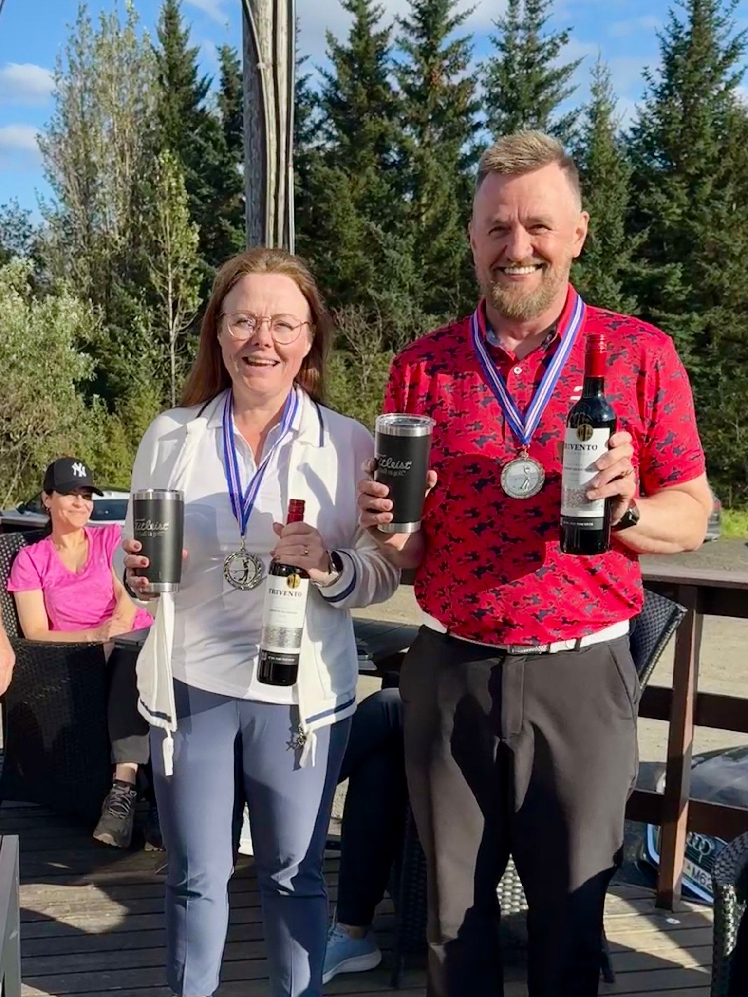 Annar sigurvegara mótsins, Sigríður Ingvarsdóttir, með Vilhjálmi Bergs stjórnarmanni. Á myndina vantar hinn sigurvegarann, Kristján Óskarsson.